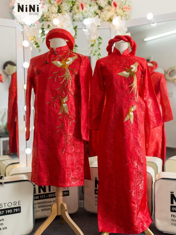 Cặp áo dài cô dâu – chú rể kết đá pha lê hoa sen bạc (CD52 + CR23)